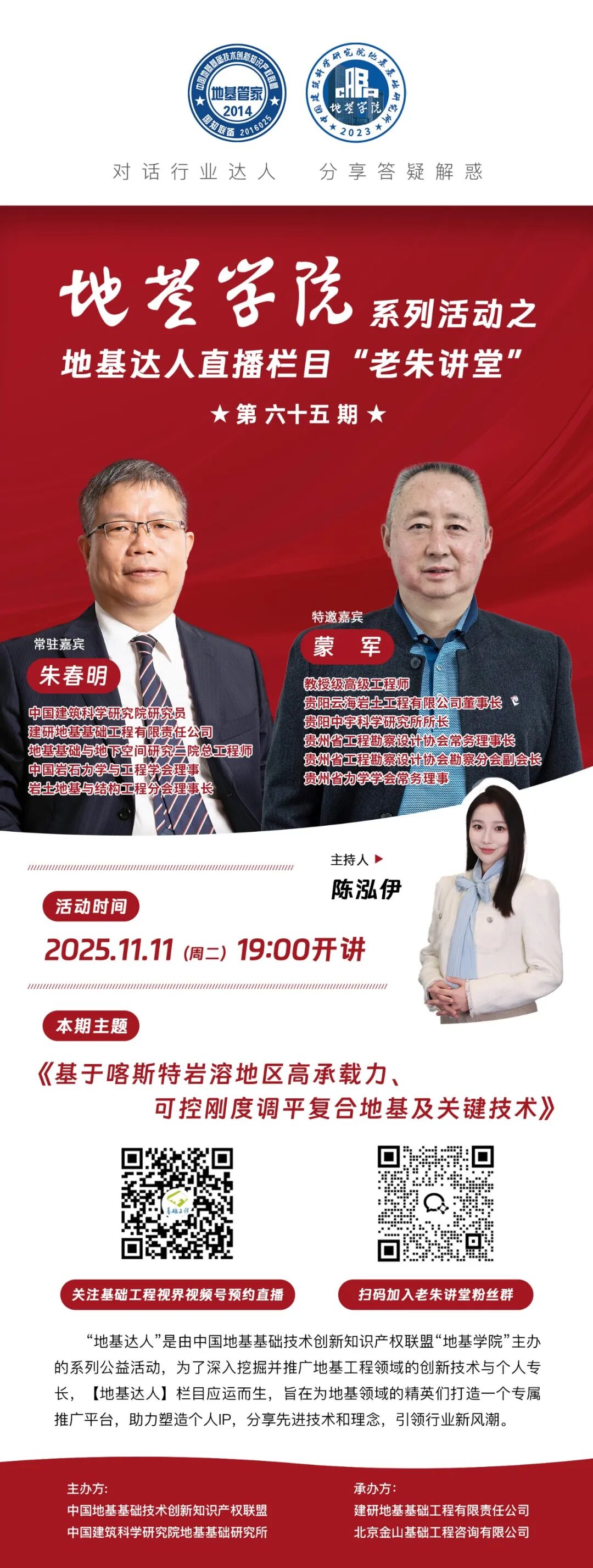 地基学院 | 地基达人-老朱讲堂(第65期):蒙军 -- 基于喀斯特岩溶地区高承载力、可控刚度调平复合地基及关键技术