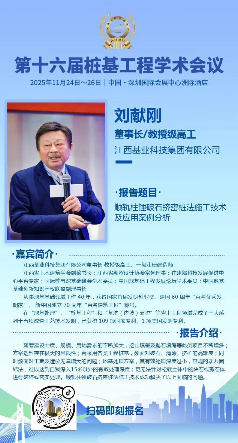 16届桩基大会-演讲嘉宾 | 刘献刚:顺轨柱锤破石挤密桩法施工技术及应用案例分析